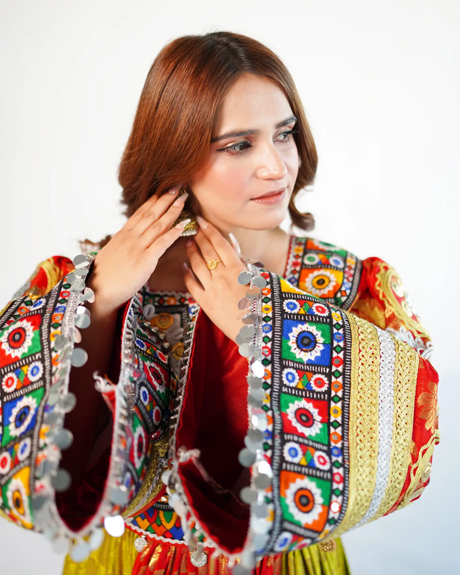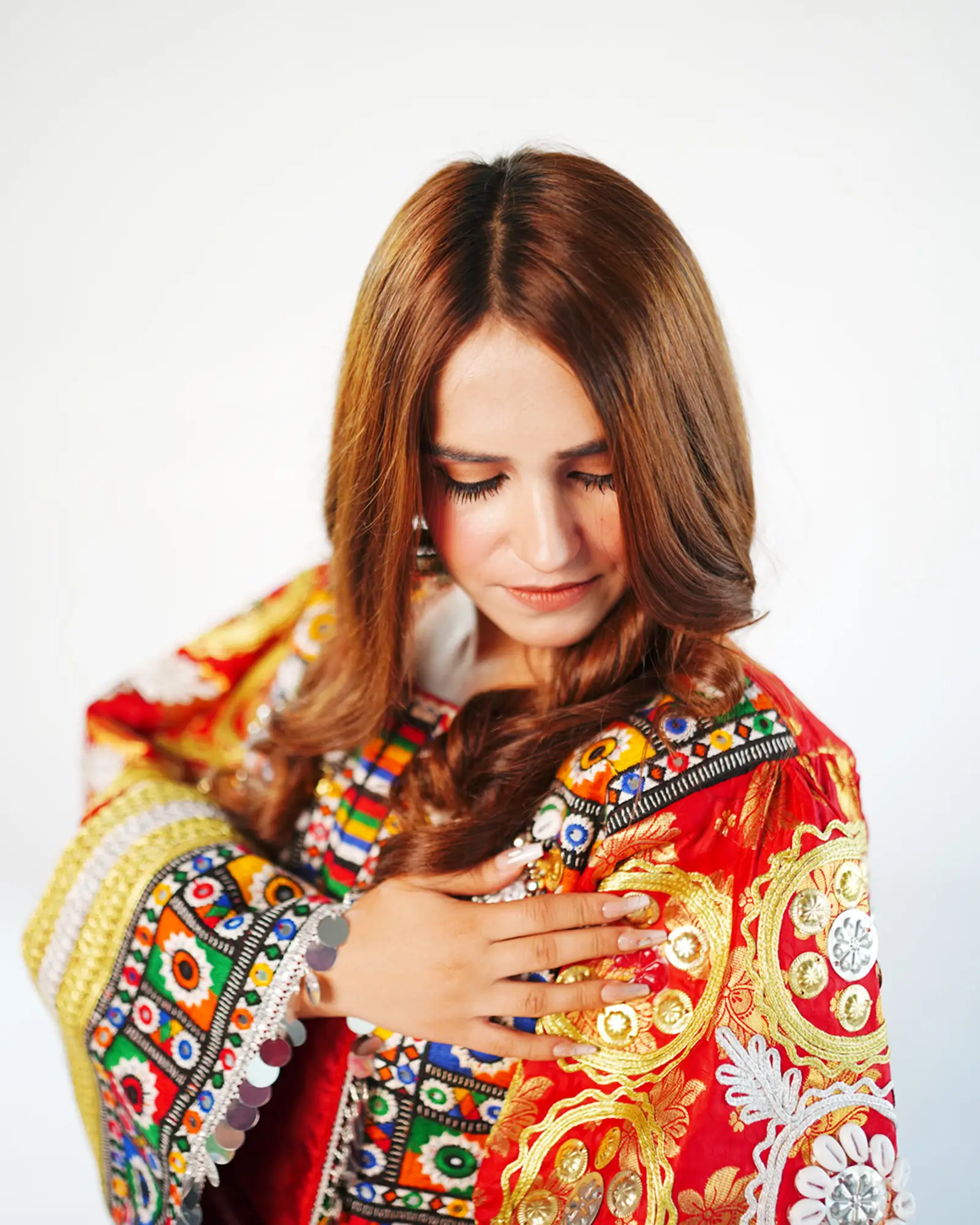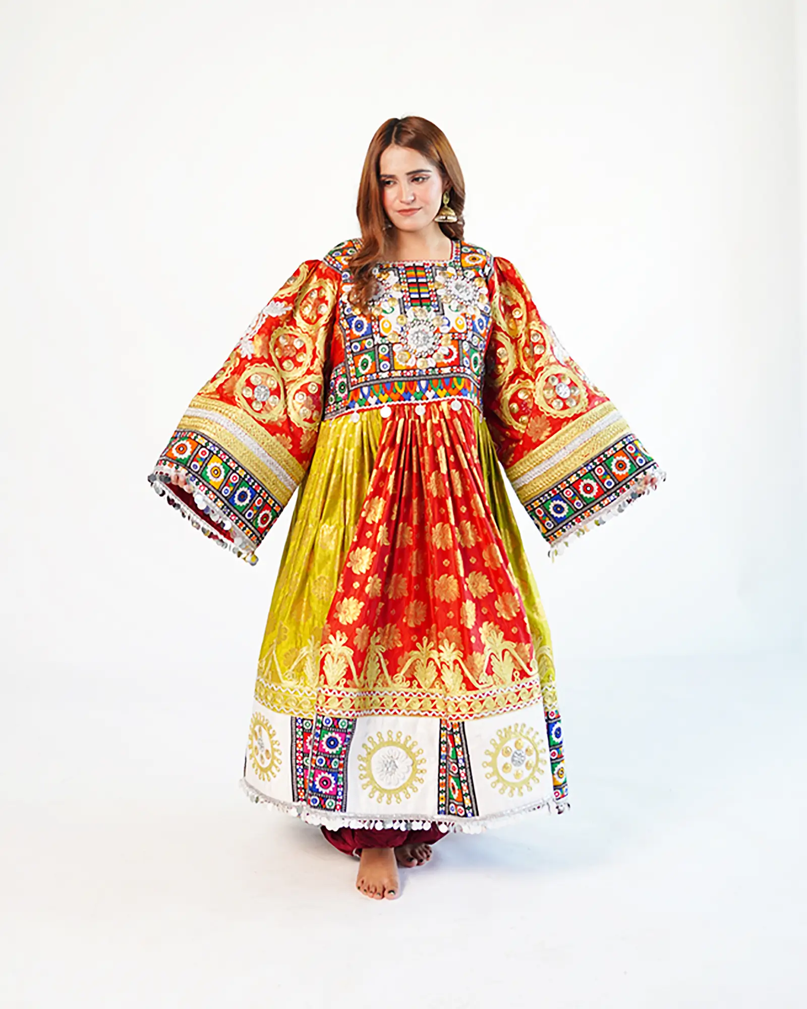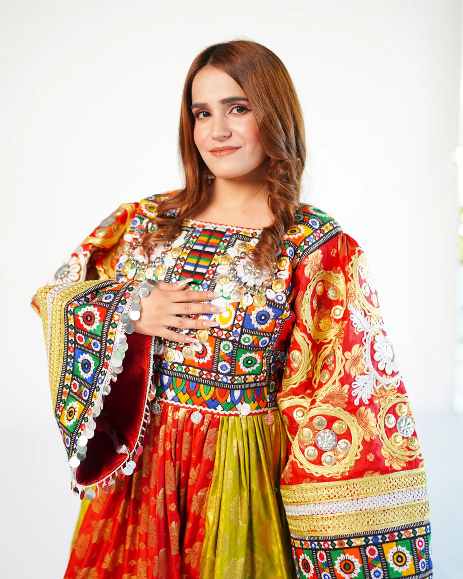 Step into elegance with our Golden Glow Afghan Kuchi Dress, a stunning blend of Afghan heritage and vibrant artistry. Handcrafted with rich red and olive tones, detailed mirror work, and golden embroidery, this dress captures the essence of traditional Afghan craftsmanship. The flowy skirt and wide sleeves add a regal touch, making it perfect for weddings, cultural celebrations, and festive occasions.