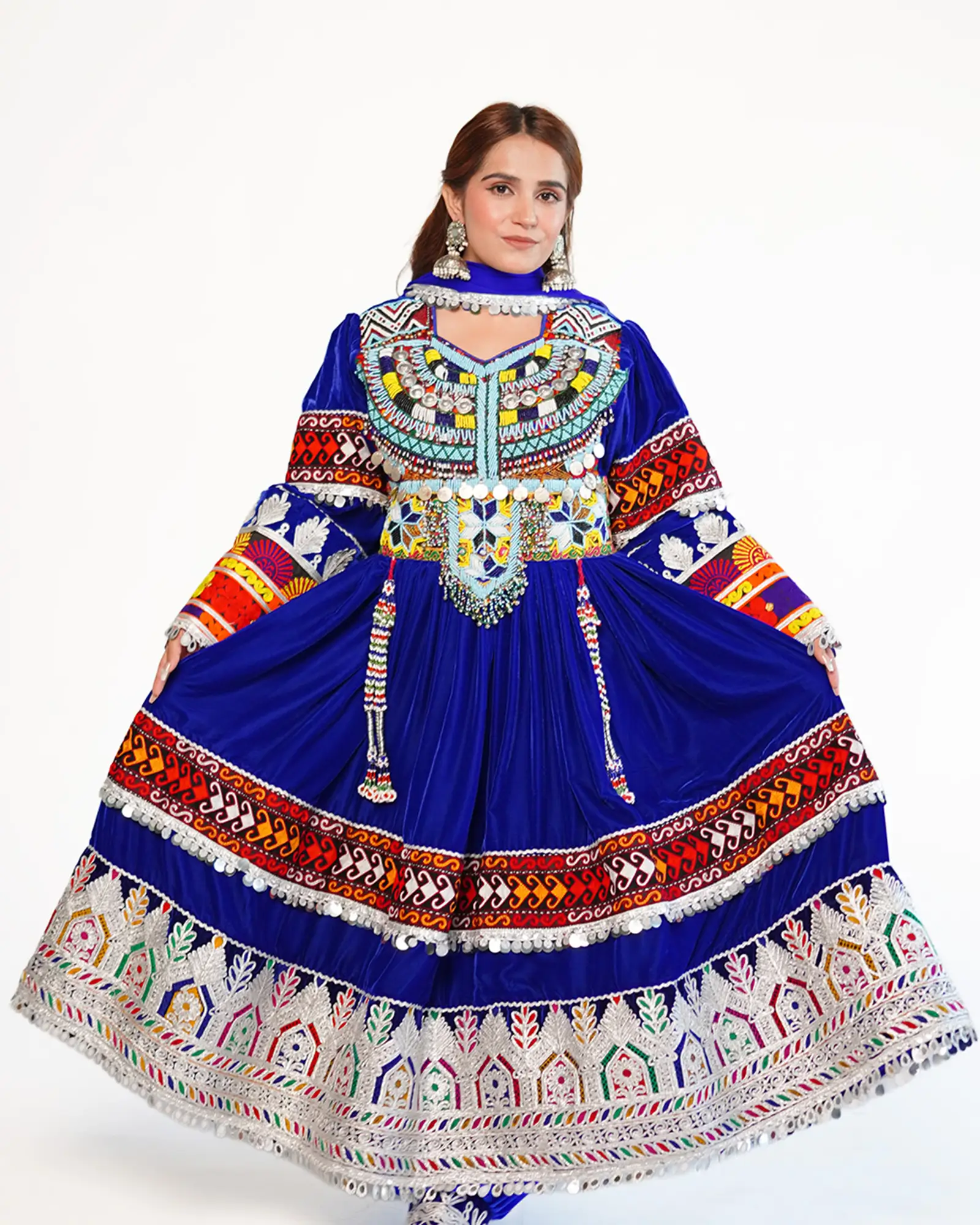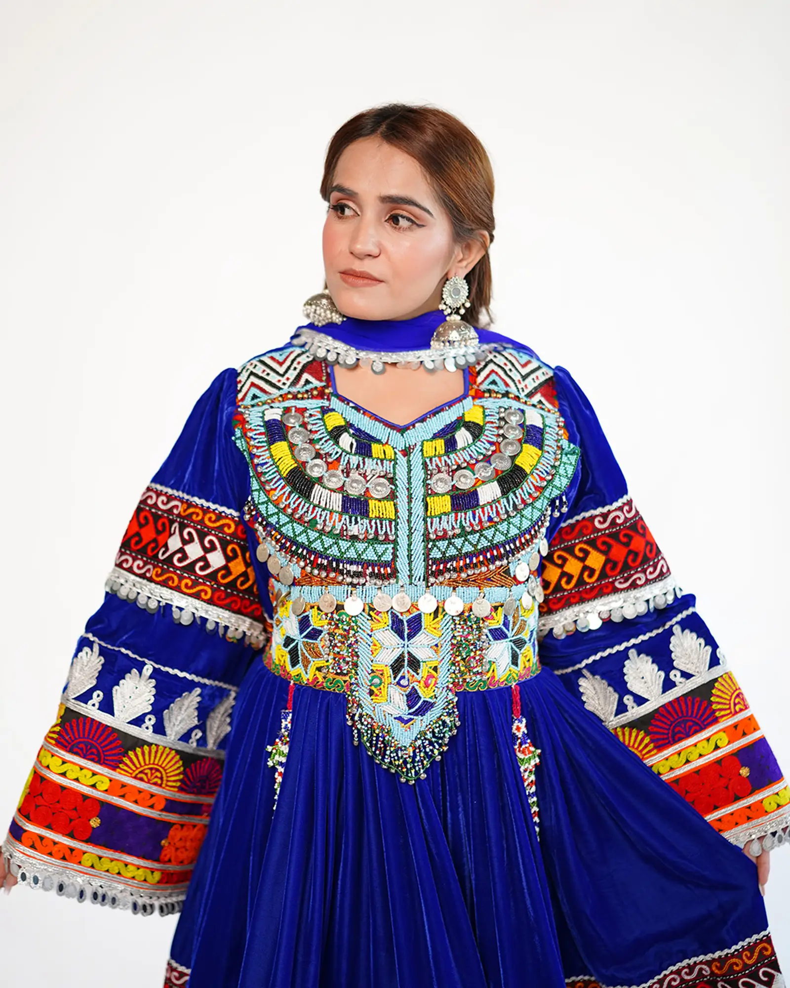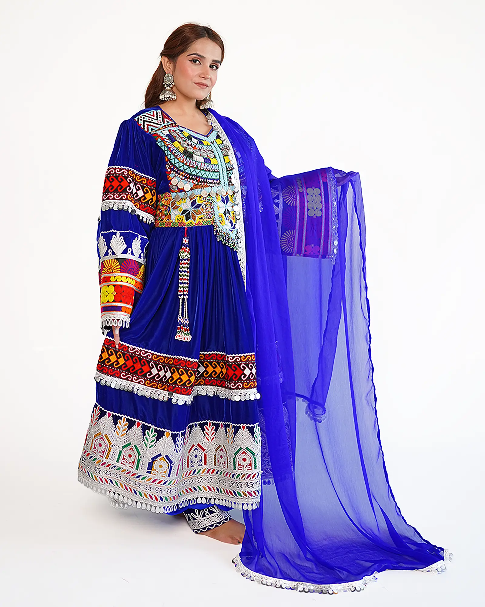 A luminous sapphire-blue dress celebrating Kuchi nomadic craft—hand-embroidered with traditional medallions, shimmering coin accents, and glass beads across the bodice and sleeves. The lightweight, flowing silhouette moves gracefully for celebrations or everyday elegance, while the rich needlework makes each piece uniquely wearable art. Recommended gentle handwash or professional cleaning to preserve the embroidery.