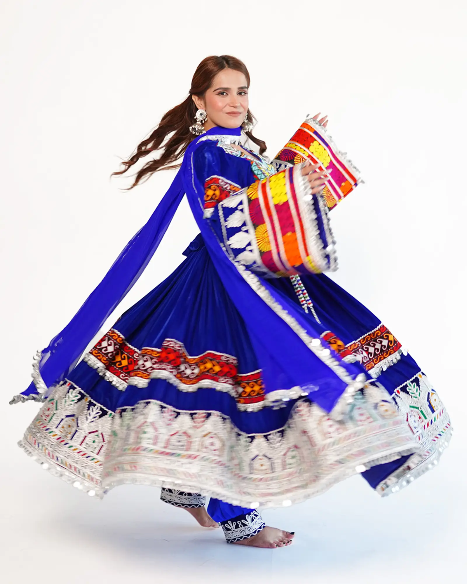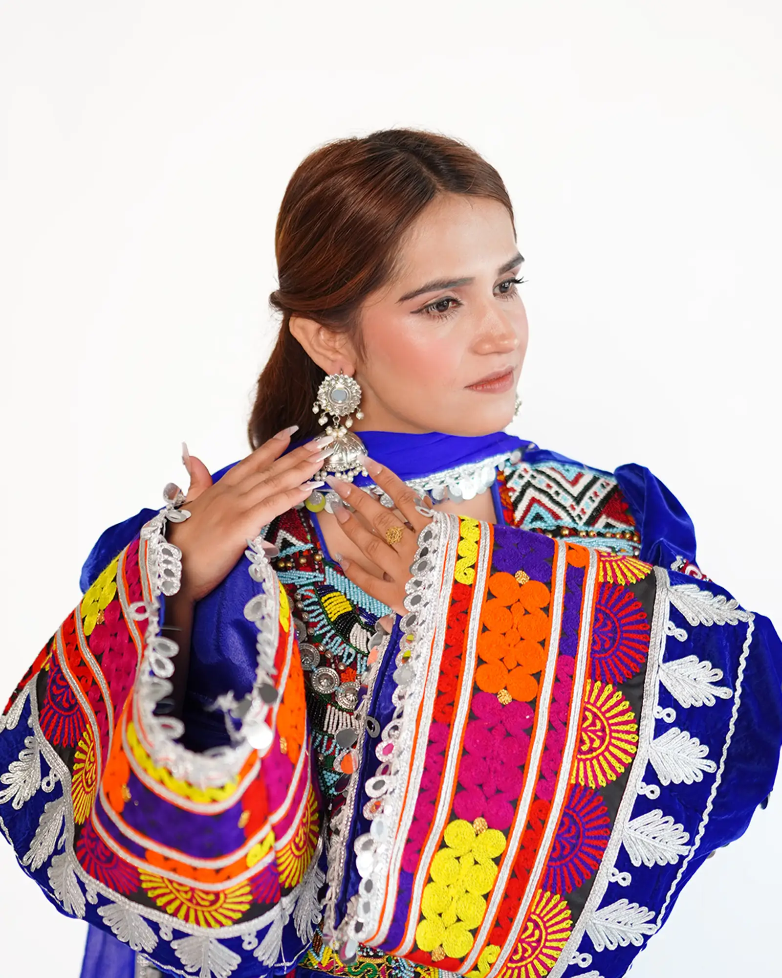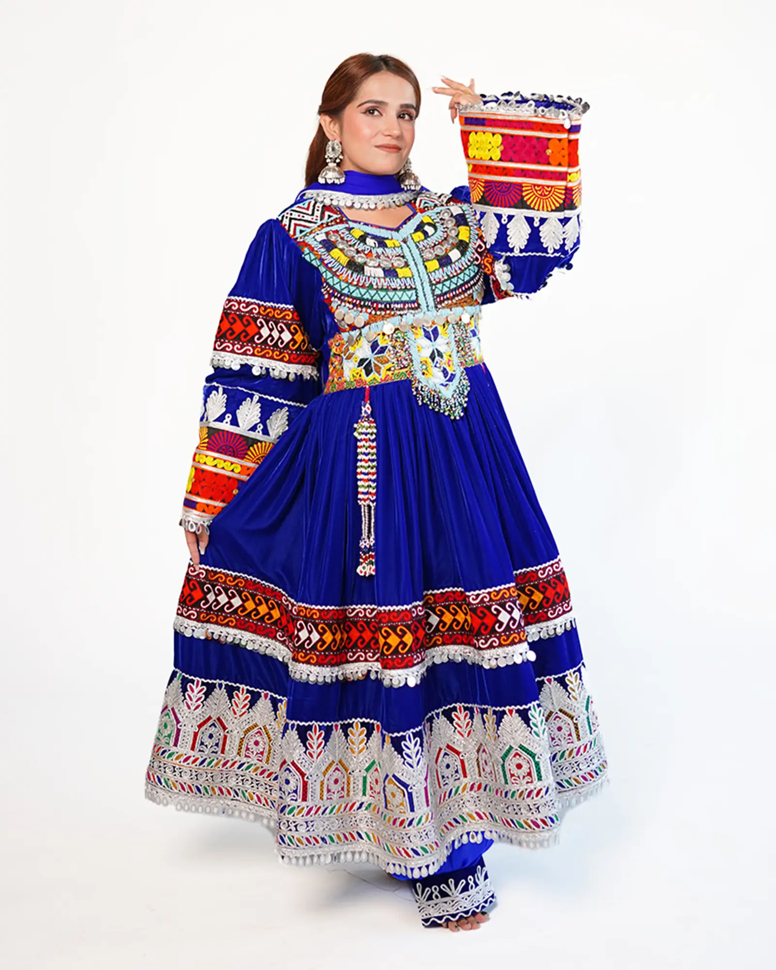 A luminous sapphire-blue dress celebrating Kuchi nomadic craft—hand-embroidered with traditional medallions, shimmering coin accents, and glass beads across the bodice and sleeves. The lightweight, flowing silhouette moves gracefully for celebrations or everyday elegance, while the rich needlework makes each piece uniquely wearable art. Recommended gentle handwash or professional cleaning to preserve the embroidery.
